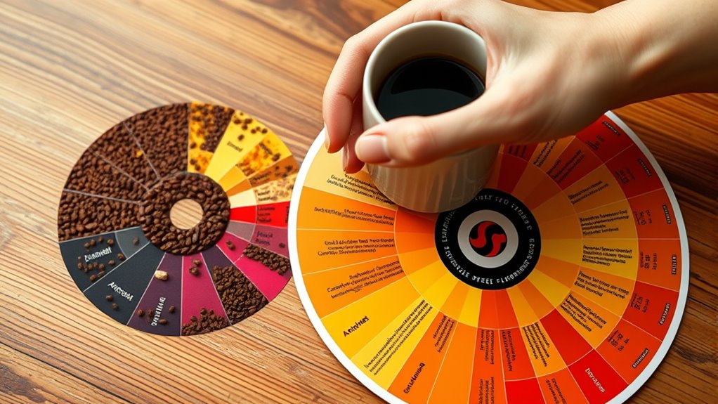 Using the Coffee Taster’s Flavor Wheel helps you identify and describe the complex flavors and aromas in each cup. Start by smelling the coffee to detect its fragrant notes, then take a gentle sip to explore initial flavors, and notice how they evolve on your palate. Match what you sense to categories on the wheel, using descriptive words to sharpen your skills. Continuing to practice with the wheel will deepen your understanding and appreciation of coffee’s rich diversity.