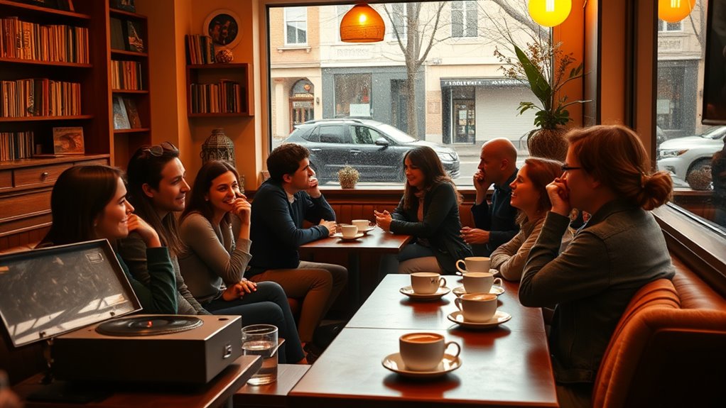 Just like a well-curated playlist sets the mood for a memorable story at Café Noir, choosing the right music enhances your conversations. Think of it as the subtle background chorus in a Shakespearean play—supporting, never stealing the scene. When you select tunes thoughtfully, you create an atmosphere where words flow effortlessly, and connections deepen. So, next time you gather, remember: your playlist is the unseen hand guiding your dialogue, making every moment feel timeless.
