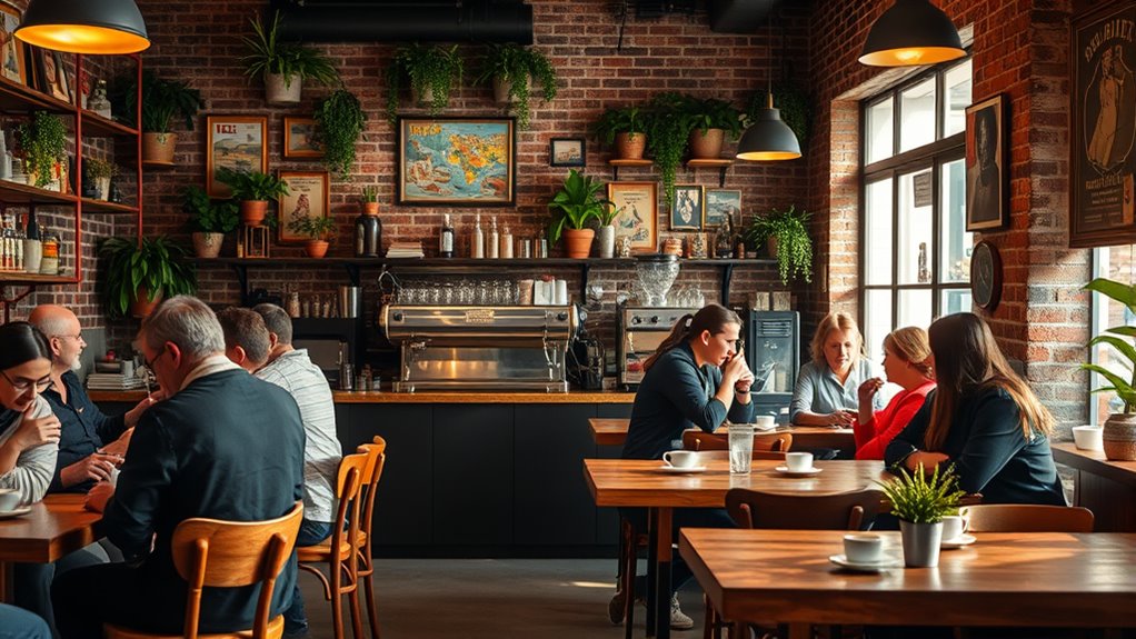 Did you know that 65% of modern cafés host community events or art exhibitions? These activities help you connect with others beyond just grabbing coffee. By offering spaces for local artists or organizing events, cafés become vibrant social hubs. You can enjoy art shows or join discussions, making the café a place where community bonds grow stronger, turning your regular coffee stop into a lively gathering spot.