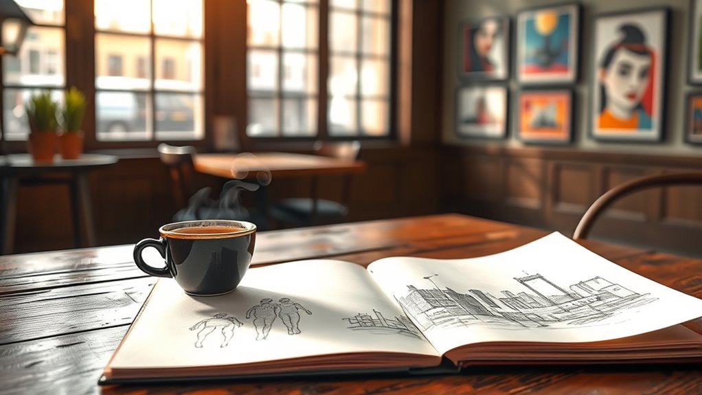 Coffee inspires your artistic journey, whether you’re sketching in a café or showcasing in galleries. Using coffee as a medium can enhance your sensory engagement and emotional expression, turning simple routines into meaningful creative practices. Mastering espresso techniques also teaches discipline and focus, which translate to your art. From textured coffee stains in your work to coffee motifs symbolizing warmth or nostalgia, there’s limitless potential. Stay with us to discover how coffee continues to fuel art from casual sketches to gallery exhibitions.