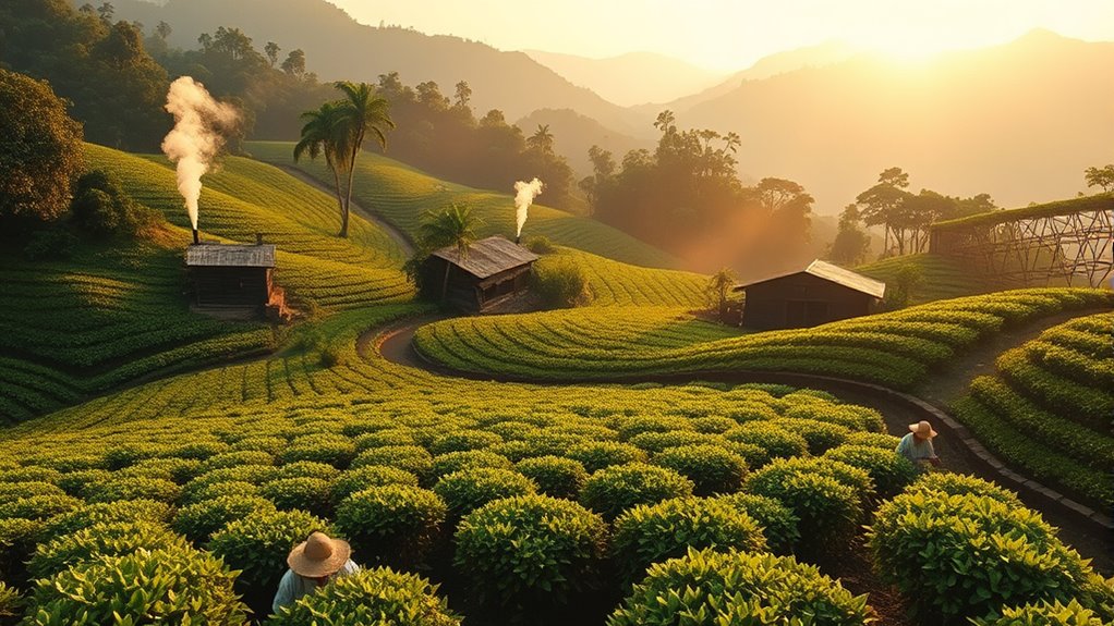 Think of coffee as a seed that transforms communities. You see, as coffee cultivation expands, it reshapes labor dynamics, often increasing reliance on enslaved and immigrant workers. This shift sparks community transformations—some towns flourish, others face social tensions. For local communities, coffee’s rise becomes a symbol of economic opportunity and hardship intertwined, shaping identities and social structures in profound ways that still echo today.