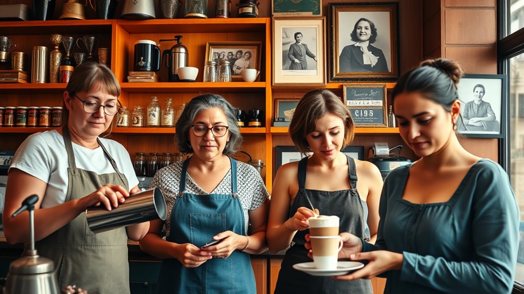 Imagine a bustling coffee shop, where female baristas craft each cup with skill—this reflects the resilience of women entrepreneurs. Historically, women like Melitta Bentz, who invented the coffee filter, made notable strides. Today, women-owned cafes thrive, showcasing their entrepreneurial spirit. You can find inspiring stories of women who’ve built coffee empires, proving that women continue to shape coffee’s rich history—one brew at a time.