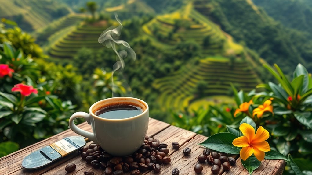As you explore Indonesia’s coffee, you’ll notice that coffee cultivation is deeply embedded in the local way of life. In Sumatra, for example, the rugged terrain and humid climate create ideal conditions for certain varieties like Mandheling and Lintong. These beans are often grown on smallholder farms, where traditional methods prevail. The process begins with careful selection and handpicking of ripe cherries, guaranteeing quality from the start. The beans then undergo specific processing methods, such as wet hulling, which imparts a unique earthy and full-bodied flavor characteristic of Sumatran coffee. Moving to Java, you’ll find a different approach. Java’s volcanic soil and cooler highlands produce beans like Java Arabica that are often cultivated on larger plantations. Coffee cultivation here involves a mix of traditional and modern techniques, with an emphasis on sustainability. Java coffee tends to have a balanced profile—mild, with hints of chocolate and spice—making it popular worldwide.