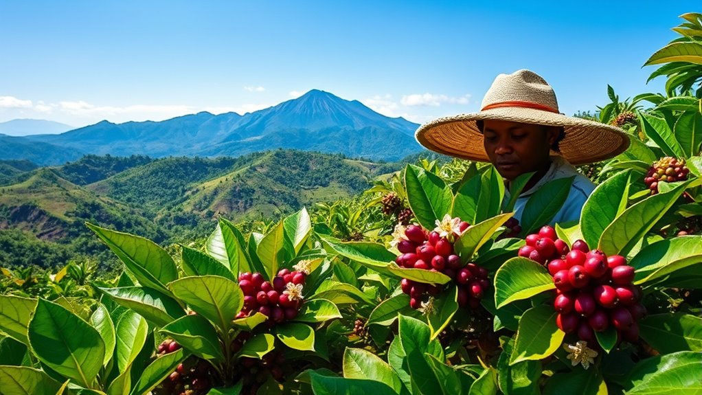 Now that you know about Uganda’s unique coffee varieties, you’ll appreciate why the country produces over 4 million bags annually. With Bugisu Arabica thriving at high altitudes and Robusta flourishing in the lowlands, Uganda’s coffee scene is truly diverse. Next time you sip your brew, remember that each cup supports thousands of local farmers and their rich traditions. It’s a flavorful journey rooted in passion, history, and a remarkable 15% global coffee share.