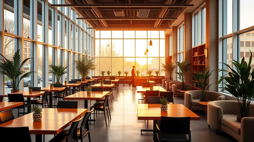 Lighting choices considerably impact your concentration in study cafés. Natural light boosts alertness and keeps you energized, making it easier to focus. Meanwhile, color schemes influenced by lighting help create a calming or stimulating environment, depending on your needs. Well-lit spaces with balanced natural and artificial light minimize eye strain and distractions, enabling you to stay engaged and productive throughout your study sessions.