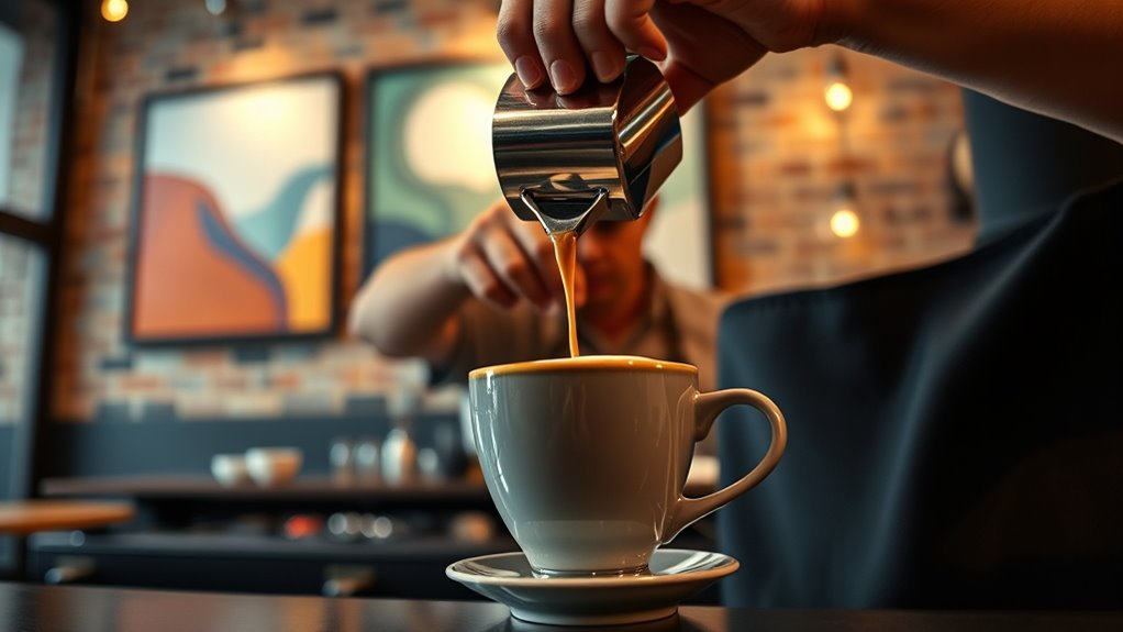 To start your own third wave coffee shop, focus on creating strong coffee shop branding that highlights quality and sustainability. Invest in barista training to guarantee your team can craft exceptional brews. Choose high-quality beans and develop a unique identity that appeals to coffee connoisseurs. With passion, attention to detail, and a clear vision, you’ll attract discerning customers and build a reputation for excellence in the third wave coffee scene.
