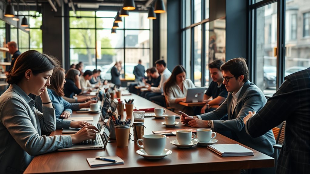 When working from a café, stick to polite etiquette by managing power outlets carefully—avoid hogging sockets and unplugging promptly. Keep noise levels low, using headphones for your audio and speaking quietly, especially during calls. Be mindful of your time to allow others to find seating, setting timers if needed. Respect the shared space to create a positive environment. Want to master these tips? Keep exploring for more ways to make your café work sessions respectful and efficient.