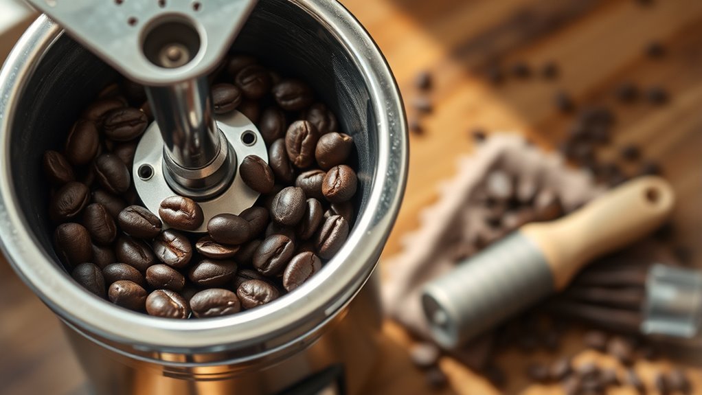 Think of your coffee grinder as a trusted garden tool; with regular care and cleaning, it stays sharp and ready to nurture your mornings. Neglect it, and it becomes dull and ineffective, spoiling your brew. By maintaining your grinder, you’re tending a delicate garden that rewards you with rich, flavorful coffee. So, treat your grinder like a prized plant—water it with cleaning, prune away residue, and watch your mornings flourish anew.