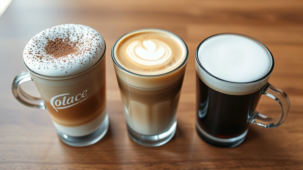 You’ll notice that cappuccino, latte, and flat white differ mainly in their milk content, texture, and ratios. A cappuccino has equal parts espresso, foamy milk, and froth, offering a rich, airy feel. A latte has more steamed milk with a thin foam layer, making it creamier and customizable. The flat white features velvety microfoam, balancing a strong espresso flavor with smoothness. Keep exploring to discover how these differences shape your perfect coffee experience.