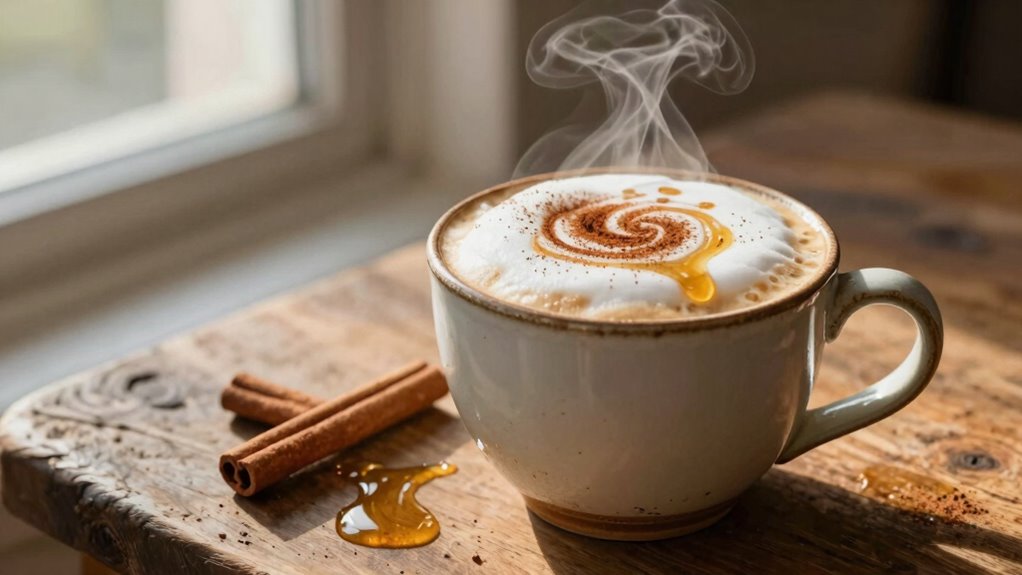 You can try sugar substitutes or natural sweeteners as healthy alternatives to honey in your latte. Options like maple syrup, agave nectar, or stevia provide sweetness without refined sugar. These choices can enhance the cozy cinnamon flavor while offering a lower glycemic index and fewer additives. Experiment with small amounts to find your perfect balance, ensuring your latte remains delicious and health-conscious.
