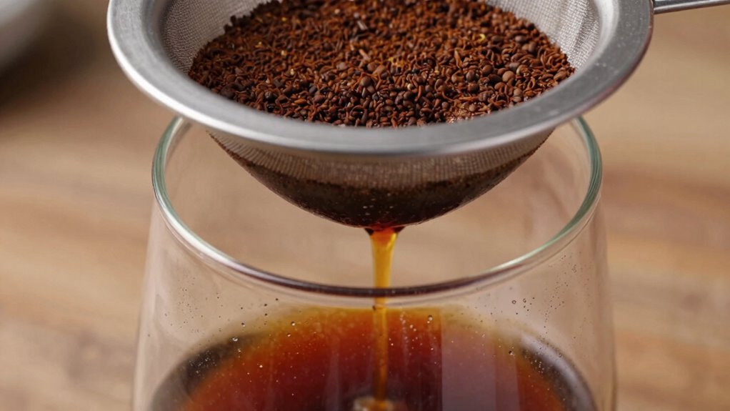 Think of your filter as a sieve for fine sand; selecting the right material and pore size makes all the difference. Metal mesh filters or fine cloth filters prevent chalky tastes by effectively trapping fine grounds, unlike coarser filters that let grit slip through. Opt for filters with small pore sizes to guarantee clarity and smoothness, keeping your cold brew tasting pure and free of unwanted chalky residue.