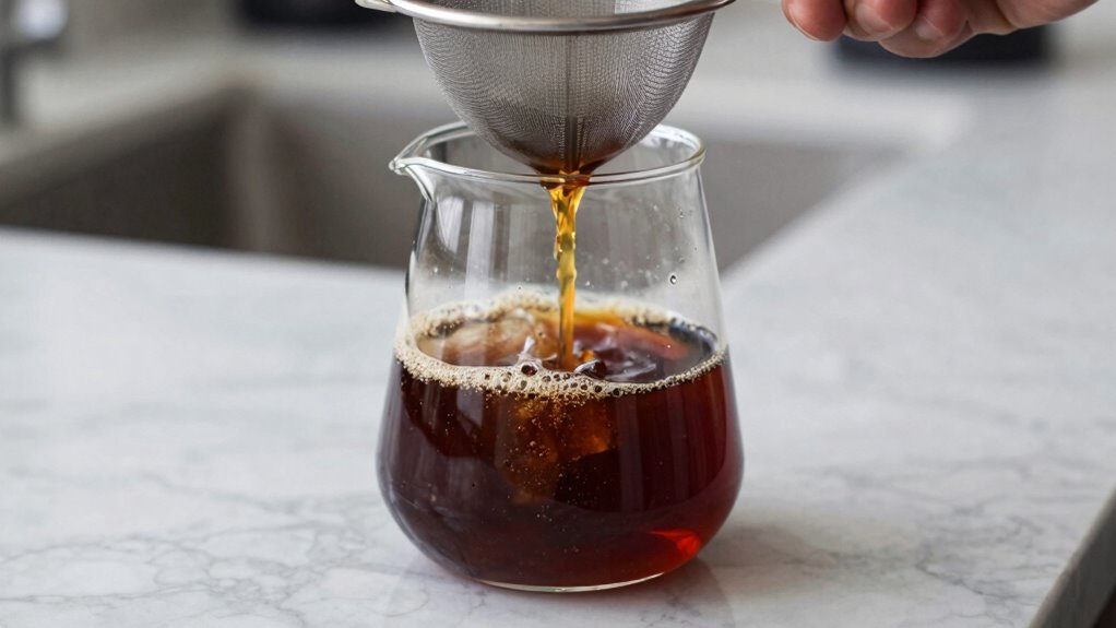 Did you know that decanting can remove up to 90% of sediment in cold brew? While decanting considerably improves clarity, it might not eliminate all sediment, especially if it’s finely dispersed. For sediment removal and flavor preservation, gentle pouring helps separate most particles without disturbing the brew’s delicate flavors. However, some tiny sediments may still remain, so patience and careful decanting are key for a cleaner pour.