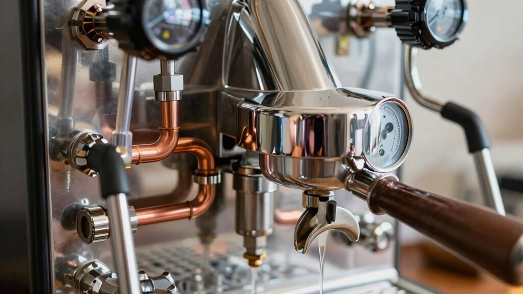 They say “a stitch in time saves nine,” so you should check your plumbing parts every 3 to 6 months. Regular maintenance keeps your machine running smoothly and extends part longevity. Inspect hoses, seals, and filters for wear or buildup, replacing them if needed. Staying proactive guarantees consistent espresso quality and prevents costly repairs down the line—think of it as giving your machine the care it deserves.