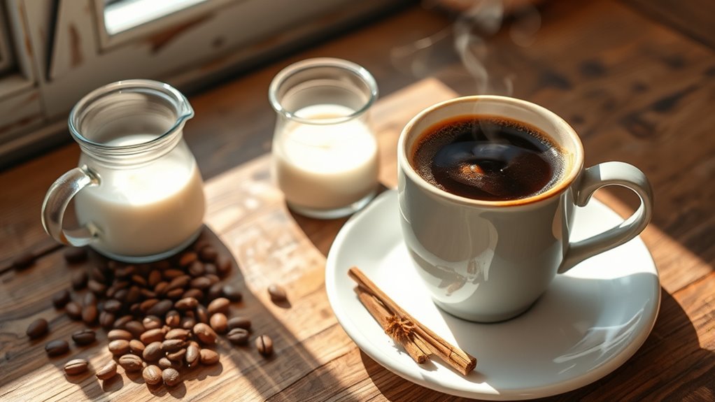 You might worry that adding milk dulls coffee’s health benefits, but it actually offers benefits too. Milk addition can enhance calcium absorption, helping your bones. Plus, it balances acidity, making your coffee easier on your stomach. Just be mindful of added sugars or unhealthy fats if you prefer flavored or creamy options. Overall, a splash of milk can boost your coffee’s nutritional value without sacrificing its antioxidants.