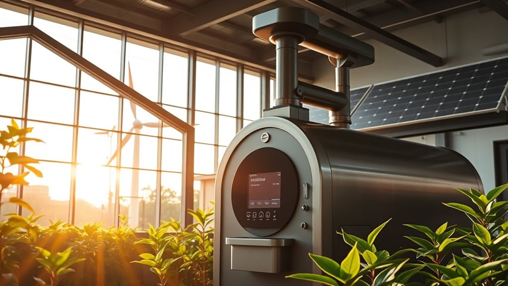 You’ll find that the latest renewable energy sources in roasting include solar integration and biofuel adoption. Solar panels are increasingly used to power roasting facilities, reducing reliance on fossil fuels, while biofuels derived from waste or plant materials offer a sustainable alternative for heat generation. By adopting these innovations, you can substantially lower emissions and improve your roasting operation’s environmental impact. These advancements help make your process more eco-friendly and energy-efficient.