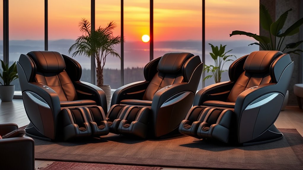 While exploring 4D massage chairs under $3000, you’ll want to contemplate the variety of massage techniques they offer. A range of options like kneading, tapping, shiatsu, percussion, and Thai stretching guarantees you can relieve muscle tension effectively. Each technique targets specific muscle groups and pain points, providing personalized therapeutic benefits. I love how multiple methods can simulate a professional massage experience, enhancing relaxation and recovery. Having diverse techniques allows me to customize sessions based on my preferences and needs, making every experience unique. Features like airbag compression, rolling, and tapping modes work together to create a dynamic, full-body massage that truly transforms my relaxation experience. Choose wisely, and you’ll find the perfect chair for your needs!