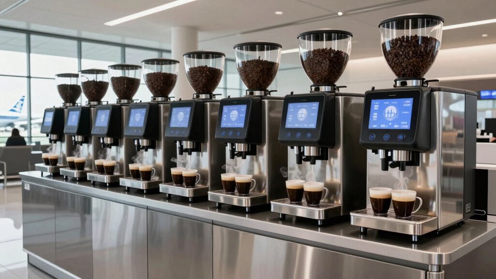 Think of energy efficiency features like a smart compass guiding your expenses. They substantially lower operational costs by reducing power consumption, much like a savvy traveler avoids unnecessary detours. With features like automatic shut-off and optimized heating, I see savings grow over time. These innovations not only cut costs but also promote sustainability, making my airport coffee service more eco-friendly and budget-conscious, all while delivering great coffee to travelers.