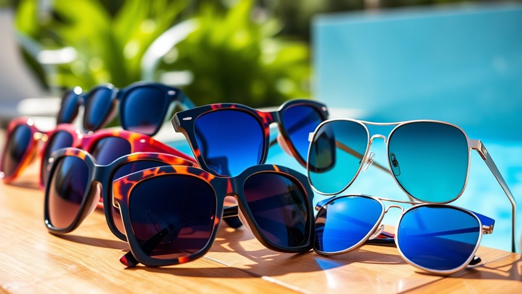 Selecting sunglasses with durable frame materials guarantees they can withstand the demands of summer activities. High-quality options like acetate, metal, or TR90 are designed for strength and impact resistance, which helps prevent breakage during outdoor adventures. Acetate frames are rigid and scratch-resistant, but they can become brittle if exposed to extreme temperatures or harsh chemicals. Metal frames, especially those reinforced with stainless steel or titanium, offer superior longevity and flexibility, making them less likely to bend or snap. Lightweight materials like TR90 are built to handle daily wear and tear while remaining sturdy—perfect for active summer lifestyles. To maximize their lifespan, it’s essential to care for your sunglasses properly by avoiding excessive heat and storing them in protective cases when not in use.