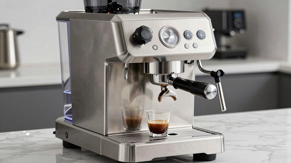 Since the durability of an espresso machine largely depends on the materials used in its construction, it is essential to pay close attention to the quality of its components. High-quality stainless steel or brass are common choices for durable machines because they resist corrosion and withstand frequent use. The materials in the pump, such as brass or stainless steel, directly impact the machine’s longevity and ability to handle high-pressure water delivery, often up to 15 bars. Selecting robust materials reduces the risks of leaks, malfunctions, and frequent replacements, ensuring consistent performance over many years. Proper material choices not only extend the lifespan but also contribute to reliable operation in both home and commercial settings, making durability a key factor in your decision.