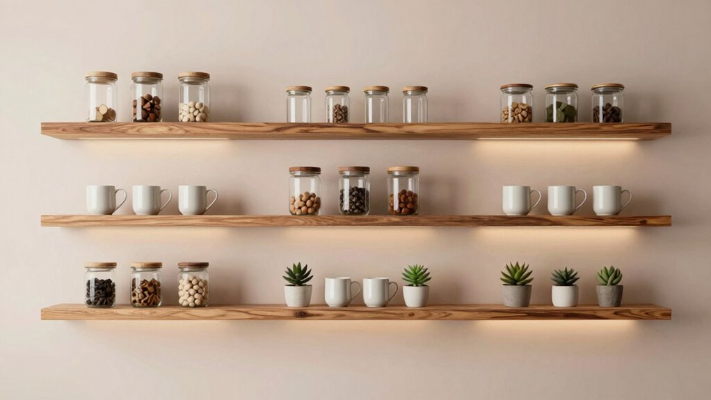 Since the weight capacity of floating shelves varies based on materials and mounting methods, it’s essential to contemplate these factors carefully. Most shelves support between 10 to 40 pounds, but this range depends on whether they’re made from solid wood, metal brackets, or particleboard. Shelves crafted from sturdy materials like wood or metal generally hold more weight than those made from MDF or particleboard. Proper wall anchoring and mounting techniques are critical to maximizing a shelf’s load-bearing ability. Overloading beyond the specified limit can cause warping, sagging, or even shelf detachment. Always verify the manufacturer’s weight limit before placing heavier items like coffee mugs, small appliances, or decorative pieces. Ensuring your shelves meet your needs without risking damage is key to a safe, functional coffee bar.