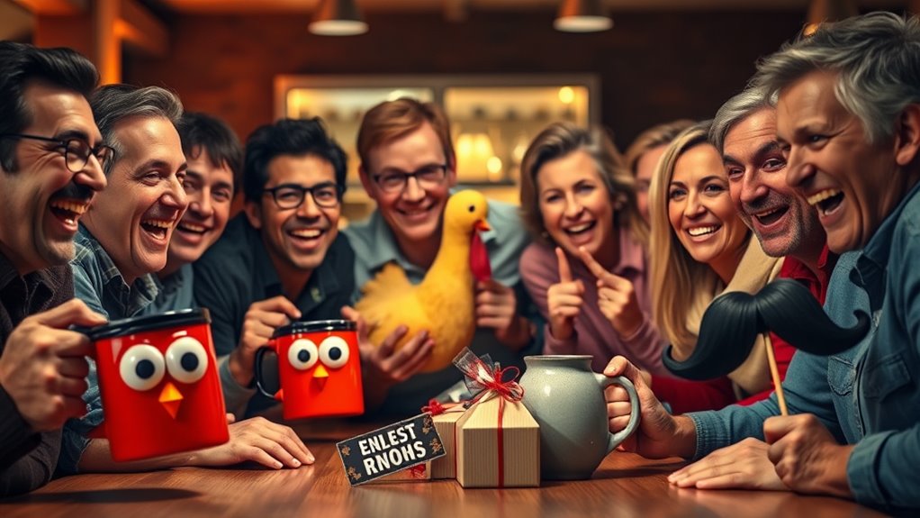 Selecting a gag gift that’s appropriate for the occasion is essential to guarantee it lands well. Think about the event’s tone—light-hearted for birthdays or playful for parties—so your gift matches the atmosphere. Consider the recipient’s age and personality to avoid awkward moments or misreading their sense of humor. For formal or professional gatherings, steer clear of anything that could be offensive or insensitive, focusing instead on safe, fun themes. Using occasion-specific humor or themes helps make your gift relevant and enhances its appeal. Matching the gift’s tone to the event’s vibe ensures it’s received as intended, whether as a good laugh or a cheeky surprise. When in doubt, opt for humor that’s inclusive and suitable for the setting.