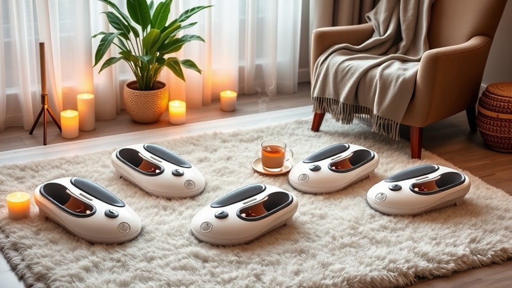 After considering the various massage techniques offered by heated foot massagers, it’s important to think about temperature control features that can enhance your relaxation experience. I love having precise temperature control, allowing me to set the water warmth between 95°F and 118°F for my ultimate comfort. Some models even maintain the selected temperature, so I don’t have to worry about the water cooling down or overheating during my soak. I appreciate adjustable settings, letting me choose hot, warm, or cooler water based on my mood or the season. Plus, safety mechanisms prevent temperatures from exceeding safe limits, reducing any risk of burns. A digital or touch screen display makes it easy to adjust settings quickly while I unwind.