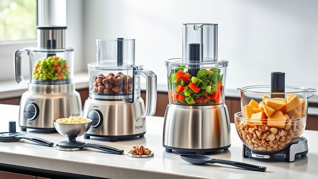 If you’re looking for the best high-capacity food processors for easy meal prep in 2025, I’ve got you covered. I’ve compiled options with powerful motors, large bowls, and versatile functions like slicing, shredding, and kneading to make cooking simpler. From sleek designs to high wattage models, these processors handle big batches effortlessly. Keep exploring, and you’ll find all the details to help you pick the perfect one for your kitchen needs.
