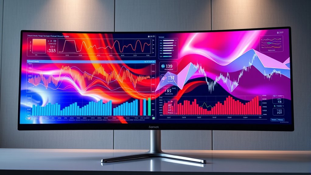 To maximize comfort during long monitor sessions, I focus on ergonomic features like adjustable height, tilt, and swivel. An ergonomic stand helps me position the screen at eye level, reducing neck strain. I also prefer monitors with anti-glare coatings and flicker-free technology, which lessen eye fatigue. Taking regular breaks and maintaining proper posture complements these features, ensuring I stay comfortable and productive throughout the day.