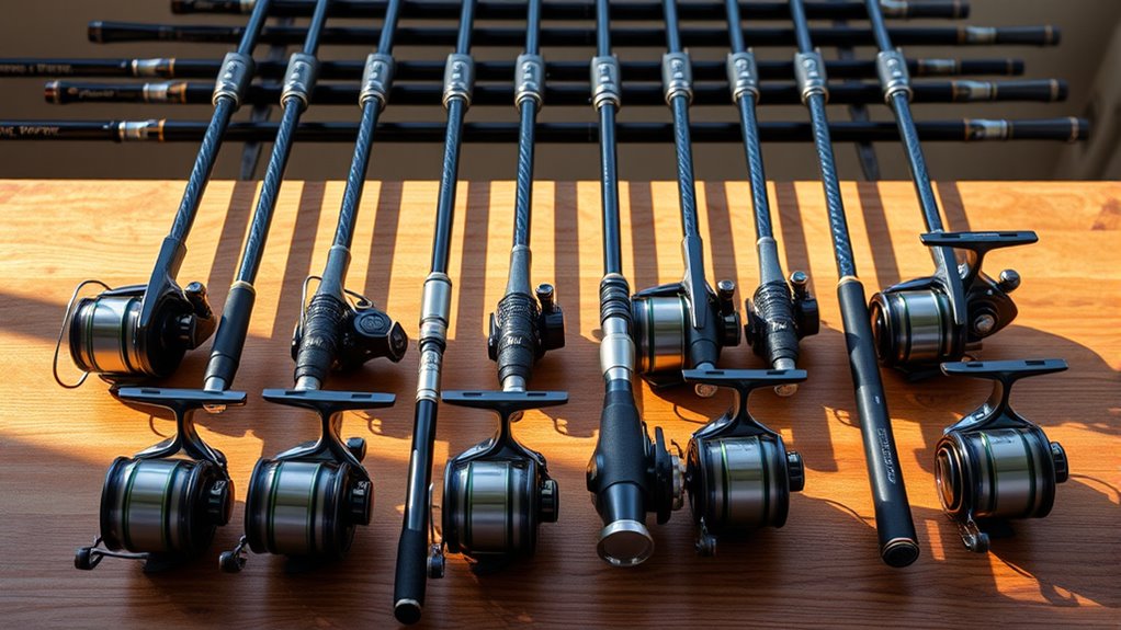 Sensitivity and responsiveness are essential factors that can make or break a high-end fishing rod combo’s performance. High-end rods often use sensitive materials like IM6 or 30-ton graphite blanks, which detect even the slightest bites. Responsiveness is boosted by lightweight construction, so I can feel tiny tugs without fatigue. Guide quality also plays a critical role; SIC ceramic or woven resin guide rings ensure smooth line flow, enhancing responsiveness. A well-designed blank with the right flex and backbone responds quickly to strikes and casting actions. Advanced blank technology and precise engineering help transmit vibrations effectively, giving me the ability to react swiftly to bites. When choosing a high-end combo, prioritizing sensitivity and responsiveness ensures I stay connected to every movement in the water.