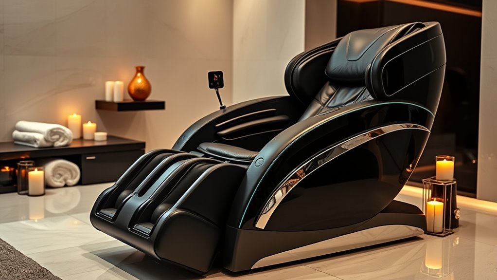 Recline and Zero Gravity features profoundly impact your overall massage experience by enhancing comfort and therapeutic benefits. Zero gravity positions lift your legs above your heart, reducing spinal pressure and improving blood flow, which makes massages more effective. Adjustable recline angles let you customize your seating for maximum comfort and targeted therapy. Full recline functions support activities like watching TV, relaxing, or even sleeping, increasing your chair’s versatility. Multi-stage zero gravity settings allow for more precise pressure relief, especially for joints and the spine. The ability to fine-tune these angles ensures personalized therapy that adapts to different body sizes and preferences. Overall, these features create a more relaxing, effective massage experience tailored specifically to your needs.