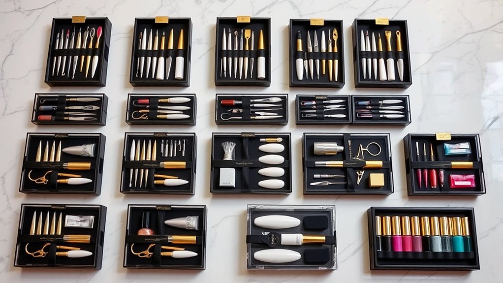 Choosing a high-end nail care kit begins with evaluating the quality of its materials, as this directly impacts safety, durability, and effectiveness. I look for tools made from surgical-grade stainless steel, which resists rust, maintains sharpness, and lasts longer. Premium kits often feature corrosion-resistant coatings and non-slip handles, ensuring safer, more precise grooming. Strict manufacturing controls are essential—tools should have consistent thickness, hardness, and edge retention. Certifications like ISO or CE are good indicators that standards are met. Additionally, I prefer kits with hypoallergenic, eco-friendly materials that reduce skin irritation and are better for the environment. Overall, high-quality materials make all the difference in creating a reliable, safe, and effective manicure experience, elevating your routine to professional levels.
