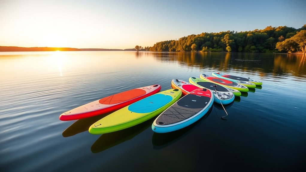 When selecting an inflatable paddle board, I pay close attention to the included accessories because they directly impact setup, safety, and overall convenience. Essential items like a pump, paddle, leash, and storage bag are vital for quick assembly, safe paddling, and easy transport. Some boards come with detachable fins, which boost stability and maneuverability in different water conditions. Additional accessories like waterproof phone cases, repair kits, and kayak seats let me customize the board for various activities, enhancing functionality. High-quality, durable accessories also guarantee safety, ease of use, and longevity. Opting for complete packages that include all necessary extras often provides better value, especially for beginners. These accessories make my paddling experience more enjoyable, safe, and hassle-free.