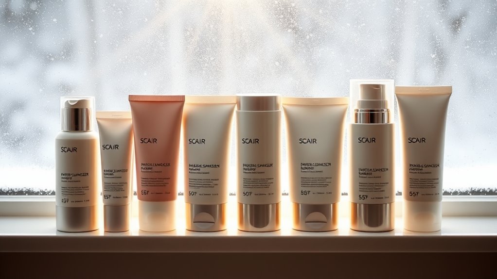 Winter weather can challenge the durability of sunscreen, especially when snow, moisture, and outdoor activities come into play. To stay protected, I recommend choosing sunscreens with at least 80 minutes of water resistance. This guarantees the product stays on your skin longer, even when exposed to snow or humidity. Sweating during winter activities can also weaken regular sunscreens, so a sweat-proof formula is vital to maintain UV protection. Water-resistant sunscreens are designed to stick around longer, providing reliable coverage in snowy or damp environments. Remember, reapplying every two hours is essential, especially if you’re active outdoors or sweating. Prioritizing water and sweat resistance helps keep your skin protected and glowing no matter the winter conditions.