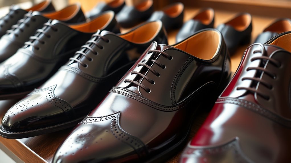 When evaluating luxury men’s dress shoes, durability is a key factor that can’t be overlooked, especially if you want your investment to last. High-quality shoes use resilient materials like full-grain leather, reinforced stitching, and sturdy soles designed for frequent wear. Construction methods such as Goodyear welted or Blake stitched considerably boost longevity by allowing easier repairs and resoling. Slip-resistant, rubberized, or composite outsoles help maintain grip and resist wear over time. Proper craftsmanship, including reinforced stress points and high-quality adhesives, prevents cracking, tearing, and deterioration. Still, even the best shoes need regular care—cleaning, conditioning, and proper storage—to truly stand the test of time. Prioritizing these durability standards ensures your shoes stay elegant and functional for years.