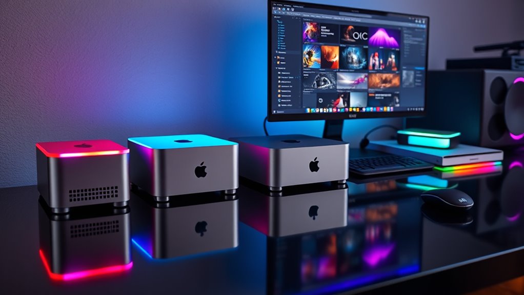 Have you ever wondered how to determine the right Mac Mini configuration for your creative projects? The key is evaluating your workload. If you’re into 4K video editing, 3D rendering, or AI model training, you’ll need higher CPU and GPU performance. Check if your applications can utilize neural engines or hardware acceleration—this can boost productivity substantially. Also, think about your peripherals and storage needs; demanding tasks often require larger RAM and faster SSDs. Consider whether you’ll support multiple high-resolution displays or need advanced connectivity options. Remember, more intensive creative work benefits from configurations with higher core counts, increased RAM, and larger storage capacity. Carefully analyzing these factors helps ensure your Mac Mini setup matches your performance demands, preventing bottlenecks and future-proofing your workflow.