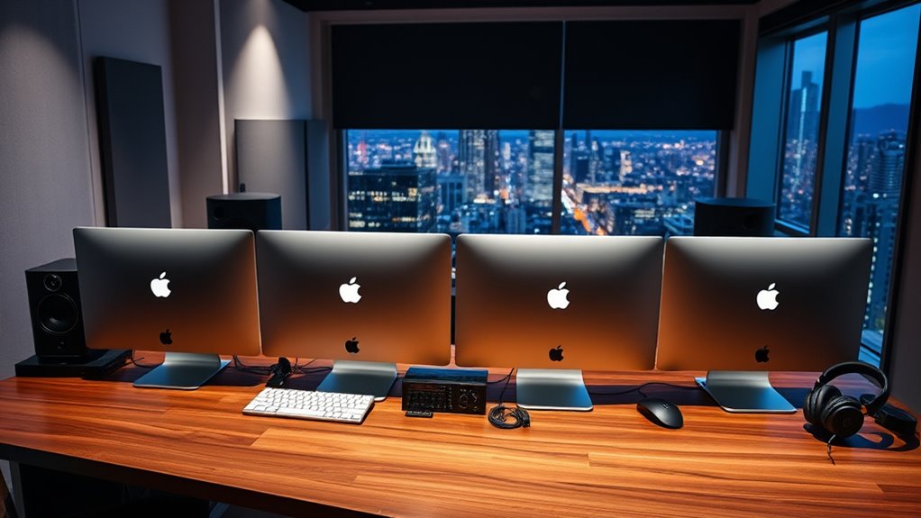 If you’re looking for the best Mac Studio options for audio production in 2025, I recommend considering the Mac mini with M4 and M4 Pro chips. These models offer powerful performance, compact size, and versatile connectivity, making them ideal for demanding studio tasks. The M4 Pro, especially, handles large projects effortlessly. To find out which model suits your needs and how to optimize your setup, stay with me as I share all the essential details.