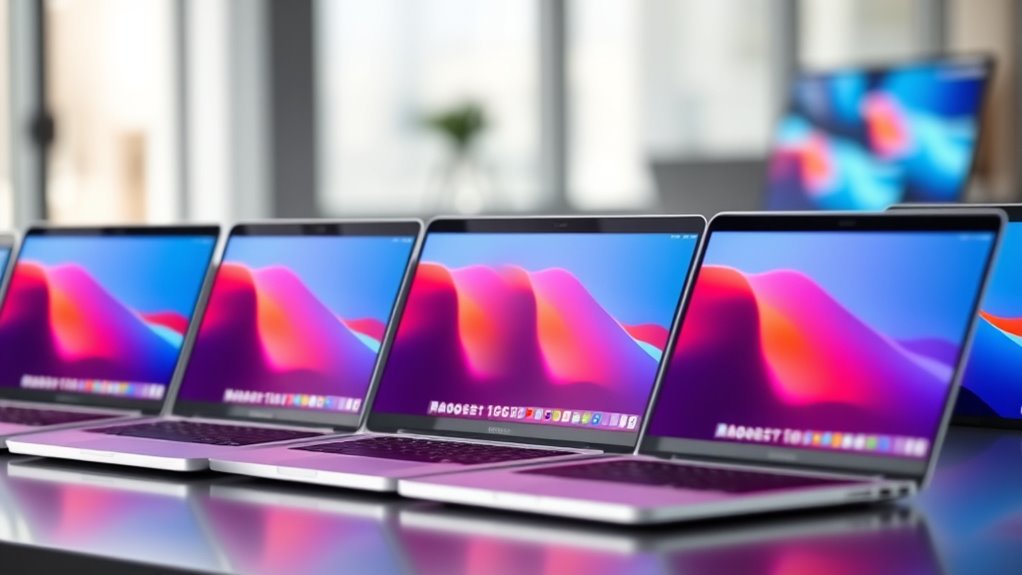 Since MacBook Air models with 16GB or more of unified memory have non-upgradable RAM, it’s vital to select the right configuration at purchase. The integrated nature of the memory within the M-series chip means you can’t upgrade later, so choosing the appropriate amount upfront is crucial. Higher RAM capacity improves multitasking, handles demanding creative workflows, and helps future-proof your device. If you anticipate running intensive applications like video editing, software development, or virtual machines, opting for the maximum available memory makes sense. Since upgrades aren’t possible later, carefully evaluating your long-term needs guarantees you won’t face performance limitations down the line. Investing in the right amount of unified memory now guarantees your MacBook Air remains capable and efficient for years to come.