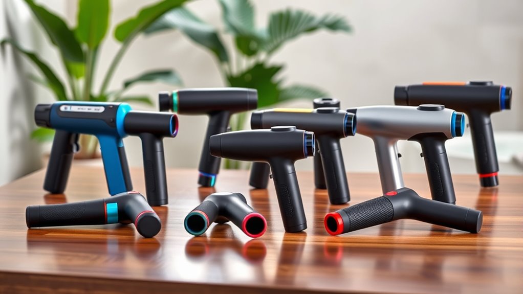 Looking for the best massage guns to ease muscle soreness and speed recovery in 2025? I’ve checked out top models with powerful deep tissue percussion, customizable speed settings, and multiple interchangeable heads for targeting different muscle groups. Many come with quiet motors, long-lasting batteries, and extra features like heat and cold therapy. If you continue exploring, you’ll discover the most effective options that fit your needs for relief and recovery.