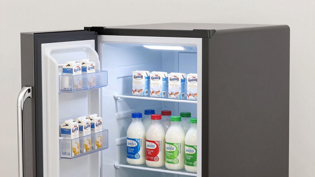 Did you know that keeping milk at 37°F (3°C) can extend its freshness by nearly twice as long? I believe mini fridges can prevent milk spoilage effectively when set to the right temperature. I always guarantee my mini fridge is properly cooled, which keeps dairy products fresh and safe. Proper temperature control is key, so I recommend checking your fridge’s settings regularly to prevent spoilage and enjoy fresh milk longer.