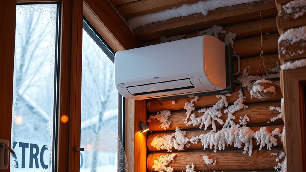 Freeze prevention technology is crucial for ensuring your mini-split heat pump keeps running efficiently in cold weather. Many models feature gold-plated fins or special coatings that resist freezing and rust, boosting durability in low temperatures. Automatic defrosting functions are common; they detect ice buildup and switch to cooling mode temporarily to melt ice, maintaining ideal performance. Advanced units use sensors to monitor outdoor coil temperature and humidity, triggering defrost cycles only when necessary to save energy and prevent freezing. Design improvements, like larger piping spaces and bottom heating elements, help reduce refrigerant line freeze-up risks. Proper refrigerant choice, such as environmentally friendly R32, combined with freeze prevention tech, ensures consistent heat delivery even in temperatures as low as -22°F/-30°C, keeping you warm and cozy throughout winter.