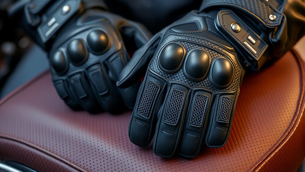 Impact protection features are essential for ensuring my hands stay safe during a fall or collision. I look for gloves with knuckle guards, finger joint armor, and reinforced palm padding, as these absorb and distribute impact forces effectively. Hard shells made of carbon fiber, thermoplastic polyurethane, or alloy steel are integrated into high-impact zones to prevent injuries. CE-certified gloves give me confidence they meet strict safety standards for impact absorption and durability. Impact-absorbing foam or gel padding strategically placed in key areas like the knuckles and palms cushions sudden impacts, reducing injury severity. These features are tested through standardized crash simulations, proving their effectiveness. Prioritizing impact protection helps me ride confidently, knowing my hands are well-guarded during unexpected falls or accidents.
