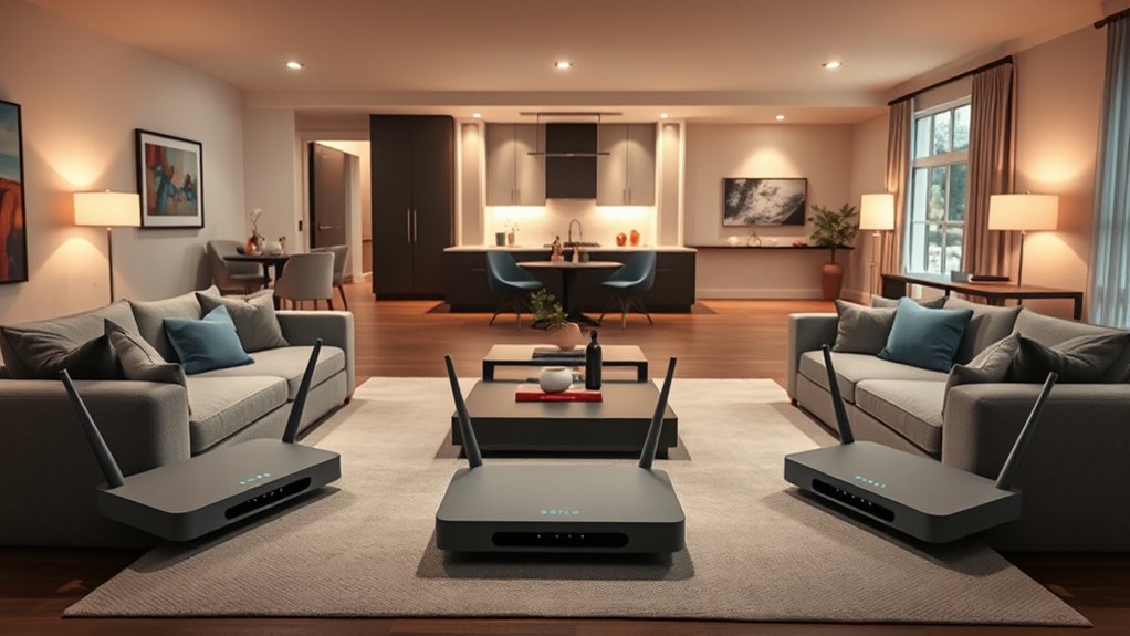 Choosing the right mesh system starts with accurately evaluating your home’s size. I recommend measuring your total square footage to determine the coverage needed. Larger homes, over 6,000 sq. ft., typically require systems with higher coverage capacities, sometimes over 10,000 sq. ft. For smaller homes, systems covering around 4,500 sq. ft. may suffice. Keep in mind, the number of rooms and obstacles like walls or floors can weaken signals, so you might need more nodes to ensure complete coverage. Check each system’s maximum coverage capacity to match your home’s layout. Remember, adding nodes can extend coverage, but their effectiveness may decrease with distance from the main router. Making sure your chosen system matches your home’s size is key to reliable, seamless Wi-Fi everywhere.