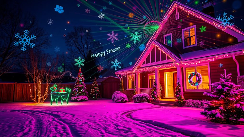 If you’re looking to brighten up your holiday decorations, I’ve found the top 15 outdoor Christmas light projectors that offer vibrant effects like snowflakes, fireworks, and starry skies. These projectors feature waterproof designs, adjustable angles, and remote controls for easy customization. Many include timers and multiple effects to create stunning displays effortlessly. If you want to discover the best options to transform your yard into a festive wonderland, keep exploring for detailed insights.