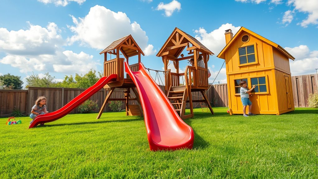 Playsets considerably influence backyard space planning by dictating layout and flow. I always measure the available area carefully, ensuring there’s enough room for safe play and movement around the equipment. I consider proximity to other features like patios or gardens, and I leave clear zones for supervision and future additions. Proper planning helps maximize fun while maintaining safety, making the backyard a practical and enjoyable space for the whole family.