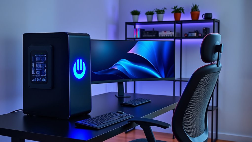 When choosing a PC for your home office, prioritizing upgrade flexibility guarantees your setup can grow with your needs. Look for models with multiple M.2 slots and accessible RAM slots to easily upgrade storage and memory. Confirm the motherboard supports the latest standards, like DDR5 RAM and PCIe 4.0 or higher, for future-proofing. Check if the power supply wattage is sufficient to handle additional components or hardware expansions down the line. Verify the availability of extra drive bays or M.2 slots to accommodate increasing storage demands. Also, consider how easy it is to access and replace components—models with tool-less access or clear upgrade instructions make this process straightforward. These features help ensure your PC remains capable and adaptable over time.