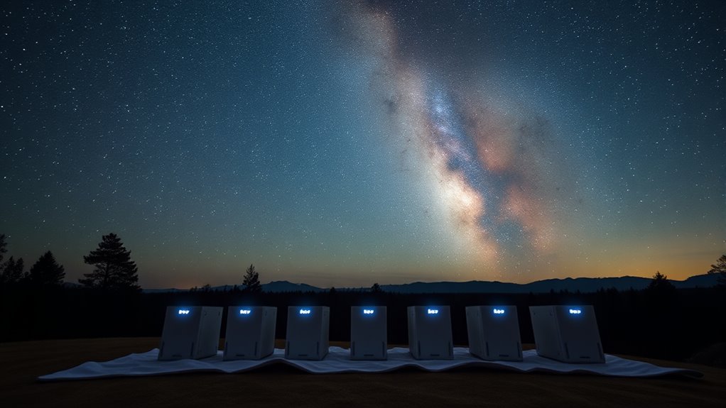 Choosing the right power capacity for your portable astronomy power station is vital for a successful stargazing experience. First, I determine the total wattage of my equipment to guarantee the power station’s capacity exceeds my combined needs. I also consider the battery capacity in watt-hours (Wh) or milliamp-hours (mAh) to estimate how long my devices can run before needing a recharge. For extended observing sessions, I opt for a power station with over 500Wh to support multiple devices for longer durations. It’s essential to evaluate my typical device power consumption and usage time. This way, I can strike the right balance between capacity and portability, ensuring I have enough power without the burden of excess weight.