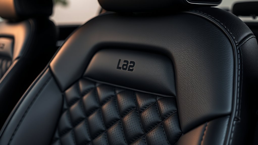 Think of premium materials as the armor of your car’s interior; they markedly extend lifespan and resist wear. I’ve found that high-quality leather or advanced fabrics like Alcantara naturally hold up better over time, even under daily stress. These materials are engineered for durability, making them ideal for long-term use. Their superior resilience means your seat covers stay looking luxurious, just like a vintage masterpiece that endures through ages.