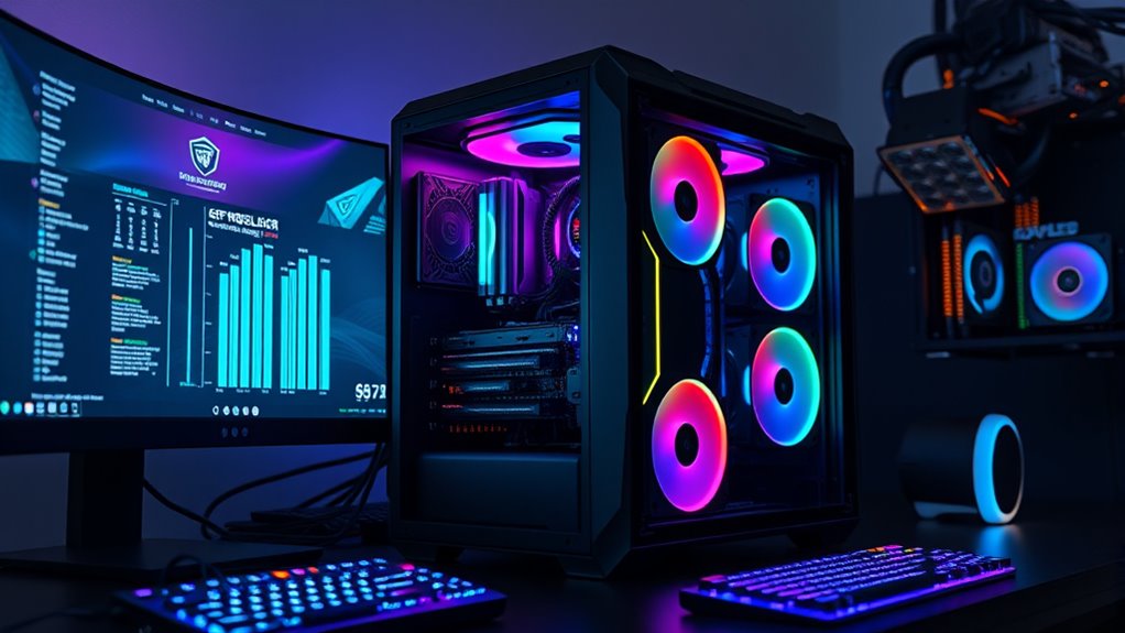 Aesthetic and design elements play a crucial role in choosing a premium CPU cooler for overclocking, as they can elevate the overall look of your build. Color schemes, lighting features, and style choices help create visual harmony and reflect your personal taste. Cooler shapes and finishes, like matte black, chromax, or brushed aluminum, add a sleek, high-end feel that complements other components. Integrated RGB or ARGB lighting allows for customization, letting you match or contrast with your system’s lighting for a striking appearance. Compact, low-profile designs are perfect for small form factor builds, combining performance with space efficiency without sacrificing style. High-quality materials and meticulous craftsmanship in design details not only enhance aesthetics but also communicate the cooler’s premium status and build cohesiveness.
