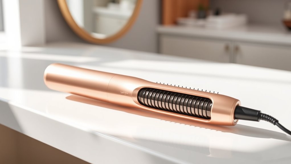 Premium brushes prevent hair damage during styling by using high-quality, ceramic or tourmaline plates that evenly distribute heat and emit negative ions, reducing frizz and static. I love how their adjustable heat settings let me choose the right temperature for my hair type, minimizing heat exposure. Plus, they often have smooth, rounded bristles that glide effortlessly, preventing breakage and split ends while giving my hair a sleek, salon-quality look.