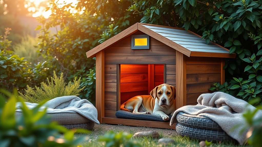 Making certain the safety of your pet in a heated outdoor house requires paying close attention to the heating system’s safety features. I always look for UL-tested options with automatic shutoff and overheat protection to prevent fires and burns. Low wattage systems, typically under 20 watts, are safer and more energy-efficient, especially when certified by organizations like UL or MET. It’s essential that the heating elements are waterproof and sealed, safeguarding against moisture and electrical shocks. Chew-resistant cords and safety-enclosed electrical components add extra protection, reducing hazards if your pet chews or interacts with the system. Finally, built-in safety features like temperature regulation and automatic shutdown ensure the system maintains a safe, consistent temperature, giving me peace of mind that my pet is protected at all times.